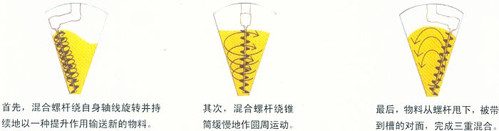 混合机筒体内螺旋轴的快速自转将物料向上提升,形成一股沿筒壁自下而上的螺柱形物流, 同时,转臂带动螺旋轴作公转运动,使螺旋轴外的物料,不同程度进入螺柱包络线内,一部分物料被错位提升,另一部分物料被抛出螺柱,从而达到全方位物料不断更新与扩散,被提到上部的物料再向中心凹穴汇合,形成一股向下的物料流,补充了底部的空穴,从而形成对流循环,由于上下物料流动的复合,物料在短时间内获得了均匀混合,混合效率高。 |