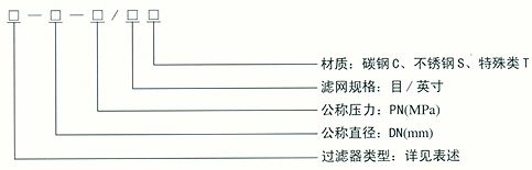 本公司生产的管道过滤器,主要有:1、Y型过滤器 2、T型过滤器 3、篮式过滤器 4、临时过滤器 5、气体过滤器。 其型号标注如下: