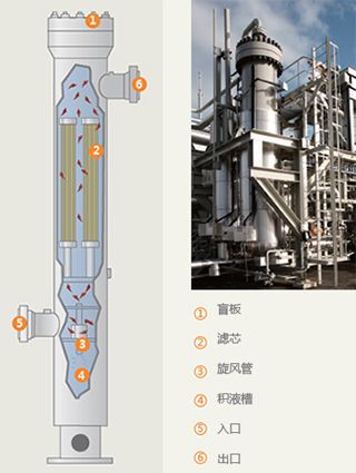 一级过滤: 旋风管式气液分离器:当含液气体进入气液分离器时,由于旋风管内的旋转漩涡设计,气流会产生强烈的漩涡运动,从而形成很强的离心力,使得固体颗粒和液体杂质贴在旋风管壁上。 杂质从气流中分离出来后,聚集在容器的积液区内。净化后的气体则以最小的压损离开旋风管式分离器进入下一级过滤。 二级过滤: 滤芯过滤与分离:这一级是由若干只可更换的或可反复清洗的过滤元件组成。 这类过滤元件的类型和精度等级要根据工作条件选择,其目的是除去最小的固体颗粒,并凝聚雾状物使液滴在分离器中被最大限度的除去。