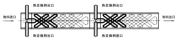 2、JHF-II型强化传热混合反应器 对于强放热的液/液反应过程可以采用JHF-Ⅱ型强化传热混合反应器。JHF-Ⅱ型强化传热混合反应器水平安装,并带有SV型静态混合器作为配件,以确保互不相溶的液/液相混合均匀,需要停留时间较长的液/液反应过程,静态混合器的长度也较长,此时各台静态混合器之间可用180°的弯头来互相连接,组成单元反应器。主要用于: (1) 聚酯熔体的冷却 (2) 丙烯腈氨化反应 (3) 氯乙酸和氨气的反应